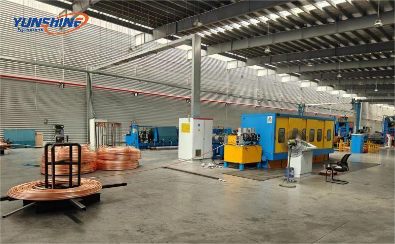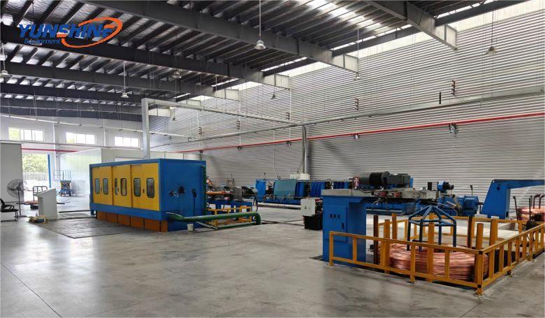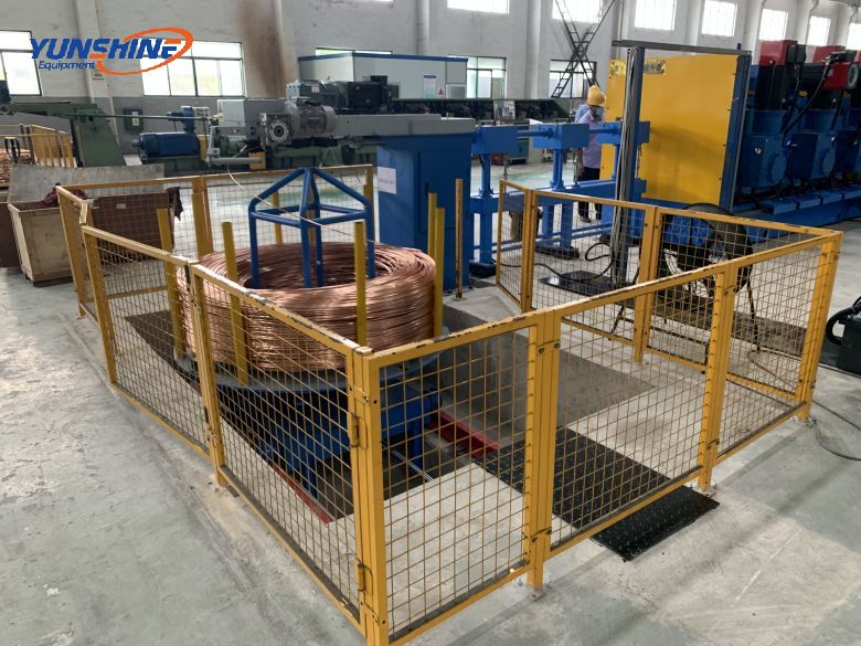 The unit melts electrolytic copper into liquid through an industrial frequency induction furnace, isolates it from the air by covering the surface with charcoal or injecting coal gas (to prevent oxidation of the copper liquid), and controls the temperature of the copper liquid at 1150℃+10℃ through a holding furnace. The continuous casting machine quickly forms copper bars in the bar casting device to continuously produce copper bars, which are finally loaded into discs through auxiliary equipment such as a single-head bar bending machine.
