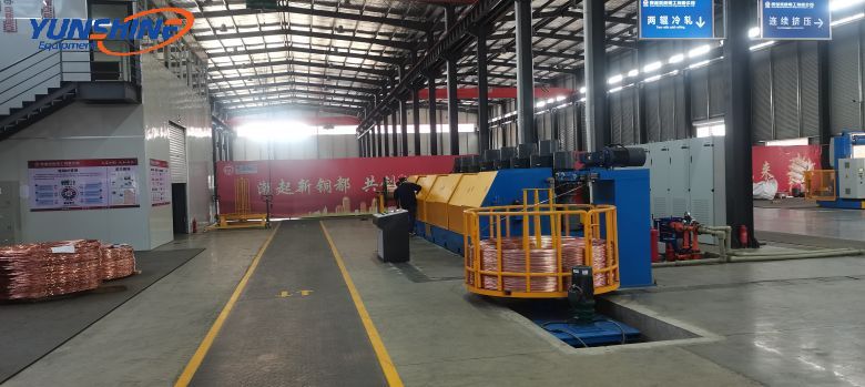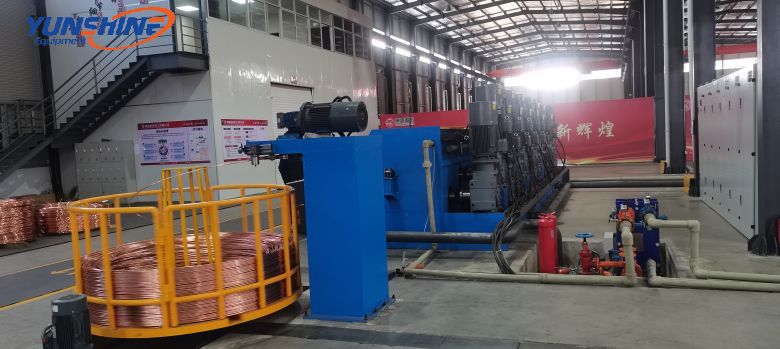 The unit melts electrolytic copper into liquid through an industrial frequency induction furnace, isolates it from the air by covering the surface with charcoal or injecting coal gas (to prevent oxidation of the copper liquid), and controls the temperature of the copper liquid at 1150℃+10℃ through a holding furnace. The continuous casting machine quickly forms copper bars in the bar casting device to continuously produce copper bars, which are finally loaded into discs through auxiliary equipment such as a single-head bar bending machine.