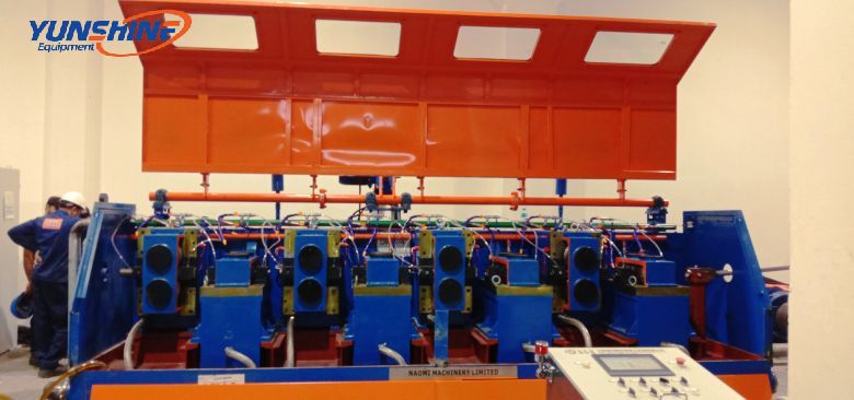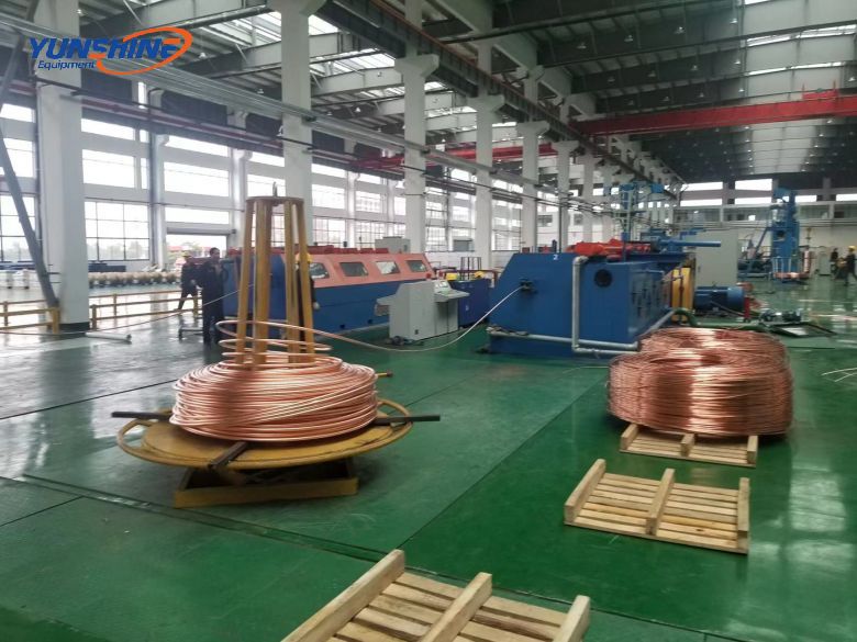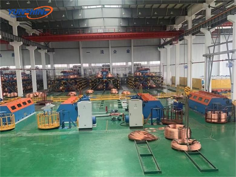 The unit melts electrolytic copper into liquid through an industrial frequency induction furnace, isolates it from the air by covering the surface with charcoal or injecting coal gas (to prevent oxidation of the copper liquid), and controls the temperature of the copper liquid at 1150℃+10℃ through a holding furnace. The continuous casting machine quickly forms copper bars in the bar casting device to continuously produce copper bars, which are finally loaded into discs through auxiliary equipment such as a single-head bar bending machine.